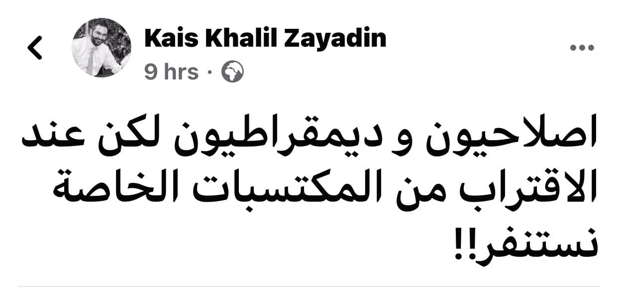 وعليه ماذا يقصد قيس زيادين من منشوره الذي قال فيه " اصلاحيون وديمقراطيون لكن عند الاقتراب من المكتسبات الخاصة نستنفر !!