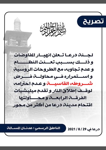 المسالمة ذكر أن "دمشق مستمرة في محاولة فرض شروط قاسية، بالإضافة إلى عدم احترام اتفاق وقف إطلاق النار، علاوة على محاولات الفرقة الرابعة المستمرة للتقدم نحو أحياء درعا البلد".