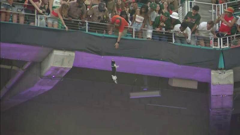 ترددت أصداء صرخات الخوف والرعب في جميع أرجاء ملعب "هارد روك" الخاص بفريق ميامي دولفينس في دوري كرة القدم الأمريكية عندما تشبثت قط بسلك المنصة قبل أن تسقط إلى الطابق الأرضي في النصف الأول من مباراة كرة القدم ليلة السبت بين جامعة ميامي وولاية الأبلاش.
