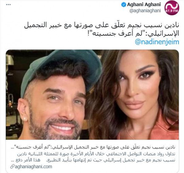 خرجت الفنانة اللبنانية نادين نسيب نجيم عن صمتها لترد على الشائعات المتداولة أخيرًا عبر رواد مواقع التواصل الاجتماعي حول الصورة التي انتشرت لها مع خبير تجميل إسرائيلي.
