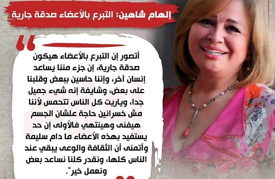 وكانت الفنانة إلهام شاهين، قد أعلنت عن تبرعها بأعضائها بعد وفاتها وذلك على هامش حفل توقيع كتاب (أعداء مصر الخمسة) للمستشار أمير رمزي، ودعت الجميع للتبرع بأعضائهم لإنقاذ حياة الآخرين حيث لا يستفيد الإنسان من أعضائه التي يأكلها الدود وتتحول لتراب بعد وفاته.