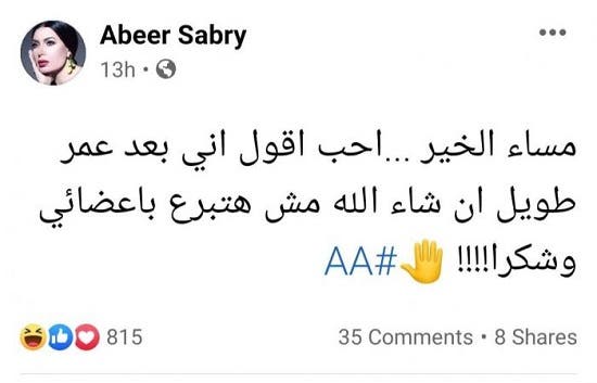 وكتبت عبير قائلة :(مساء الخير...أحب اقول اني بعد عمر طويل ان شاء الله مش هتبرع بأعضائي وشكرا!!! ).