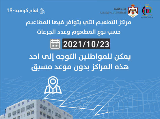 نشرت وزارة الصخة اسماء مراكز التطعيم التي يتوافر فيها المطاعيم حسب نوع المطعوم وعدد الجرعات ليوم السبت الموافق 2021/10/23 حسب الروابط التالية: