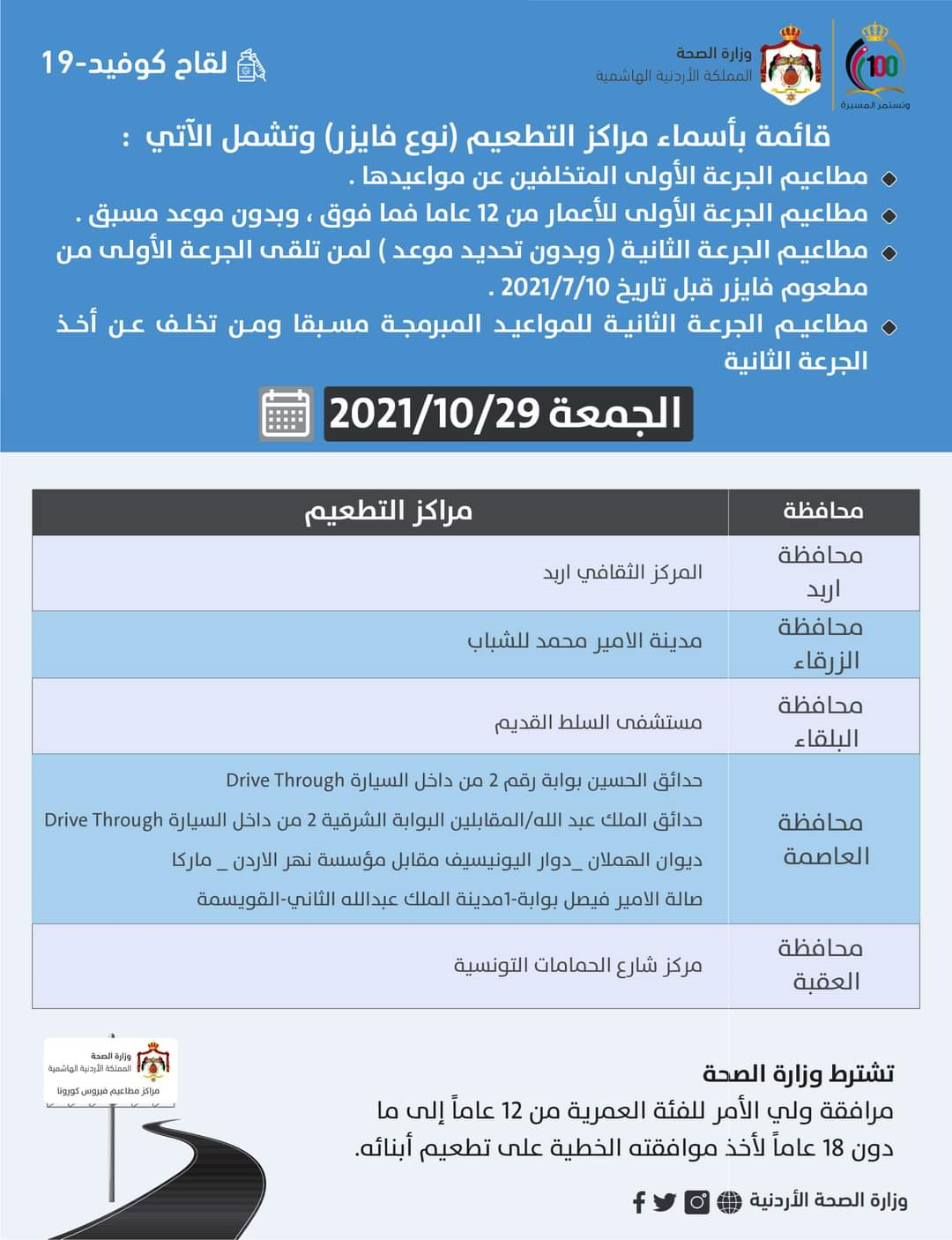 أعلنت وزارة الصحة عن اسماء مراكز التطعيم التي يتوافر فيها المطاعيم حسب نوع المطعوم وعدد الجرعات.