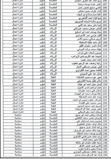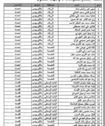 تدعو دائرة الاحصاءات العامة بالتنسيق مع ديوان الخدمة المدنية المبينة اسماؤهن من حملة شهادتي البكالوريس و الدبلوم المتوسط مراجعة دائرة الاحصاءات العامة قسم دائرة التخطيط و الكائن مقرها في الجبيهة قرب وزارة التعليم العالي و البحث العلمي وذلك لاجراء المقابلات الشخصية للعمل بوظيفة باحثة على حساب المشاريع الؤقتة وذلك يوم الخميس الموافق ٢٥/١١/٢٠٢١ حسب الكشف المرفق وكل من يتخلف عن الحضور تعتبر مستنكفة عن العمل بهذ ا المشروع.
