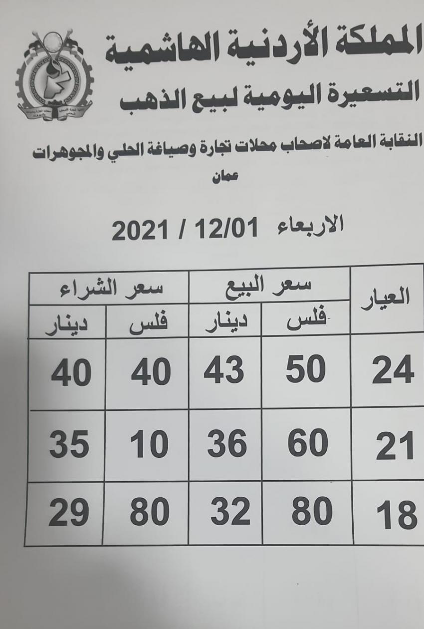 كما بلغ سعر بيع الغرام من الذهب عياري 24 و18 لغايات الشراء من محلات الصاغة عند 40.40 و 29.80 دينارا.