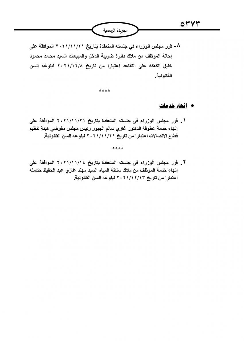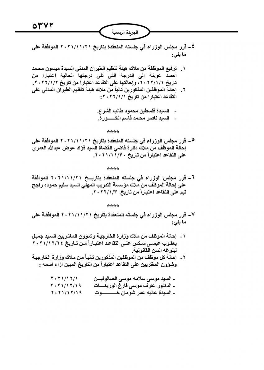 صدر في عدد الجريدة الرسمية أمس الأربعاء، قرارات مجلس الوزراء باحالة عدد من موظفي الدولة الى التقاعد، وانهاء خدمات آخرين.