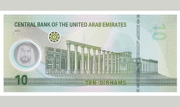 حافظت الورقة النقدية الجديدة من فئة العشرة دراهم على لونها الأخضر، ليكون مماثلًا للون الورقة النقدية الورقية المتداولة حاليًا. ويظهر في وسط الوجه الأمامي صورة مسجد الشيخ زايد الكبير الذي يُعد معلمًا دينيًا، وطنيًا، وثقافيًا بارزًا في الدولة، ويحظى بمكانة متميزة على مستوى العالم،. كما يظهر في وسط الوجه الخلفي للورقة النقدية صورة "مدرج خورفكان" كأحد المعالم الثقافية البارزة في إمارة الشارقة.