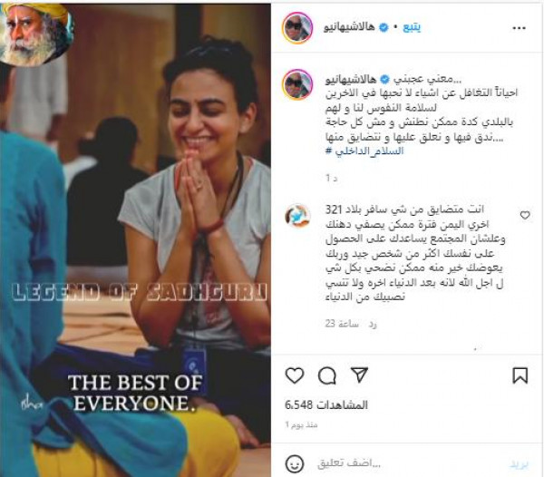 ونشرت حلا مقطع فيديو وجّهت من خلاله نصائح الى جمهورها قائلةً: "معنى عجبني، أحياناً التغافل عن أشياء لا نحبّها في الآخرين، مهم لسلامة النفوس لنا ولهم"، وفق (لها).