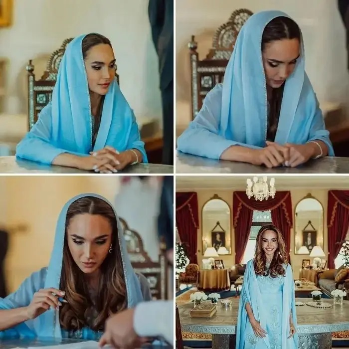 وخلال لحظة توقيع عقد الزواج، حرصت العروس على تغطية شعرها بـ"شال" ناعم تم تصميمه من نفس لون ونوع قماش الثوب الأزرق الذي كانت ترتديه.