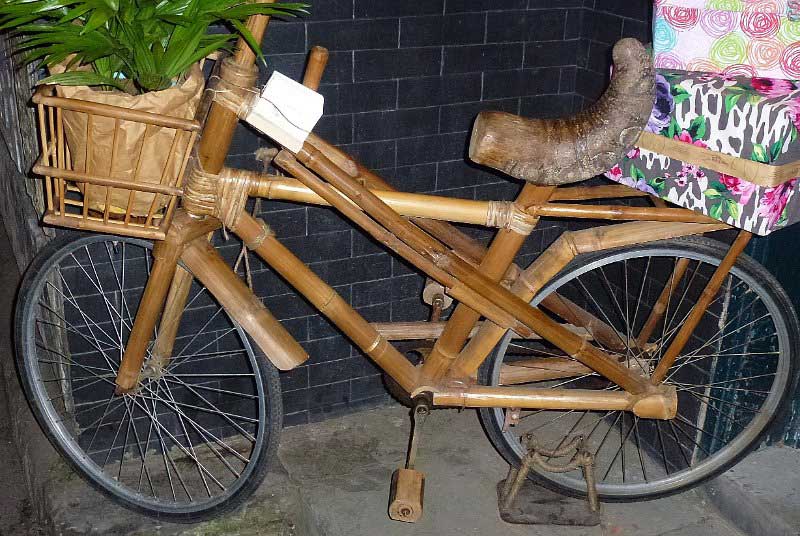 تقطع عصي الخيزران التي تنمو في المناطق المحيطة، وتعالج لعملية الحفظ قبل تجميعها مع الأجزاء الأخرى لتشكيل إطار الدراجة.