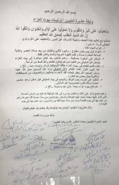 وجاء في الوثيقة، أن يكون يوم العزاء الأول مفتوحا، واليوم الثاني والثالث بعد صلاة العصر ولغاية الساعة العاشرة مساء، وتقديم القهوة العربية والماء والتمر فقط.