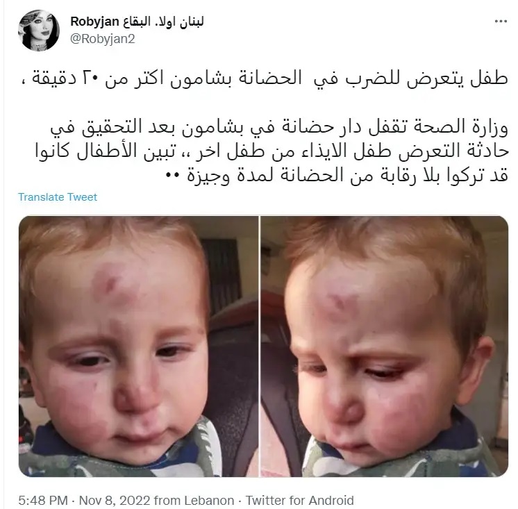 وبدأت الواقعة حين نشرت والدة الطفل "م.د." البالغ من العمر 11 شهرًا، صورًا له عبر حسابها على "فيسبوك"، لتروي تفاصيل الحادثة المؤلمة التي تعرض لها طفلها الصغير خلال تواجده في حضانة B.N الواقعة في قرية بشامون الموجودة في محافظة جبل لبنان.