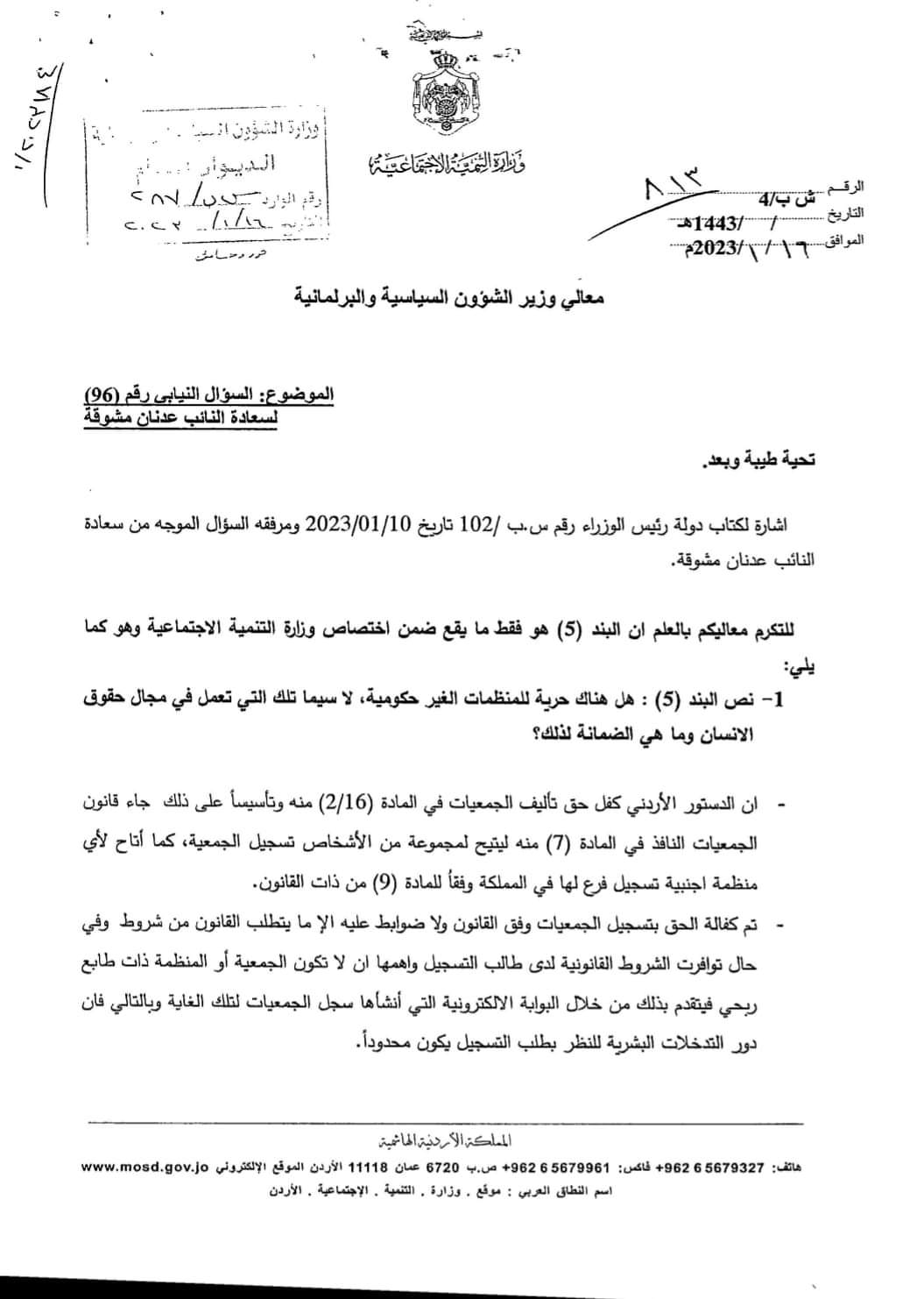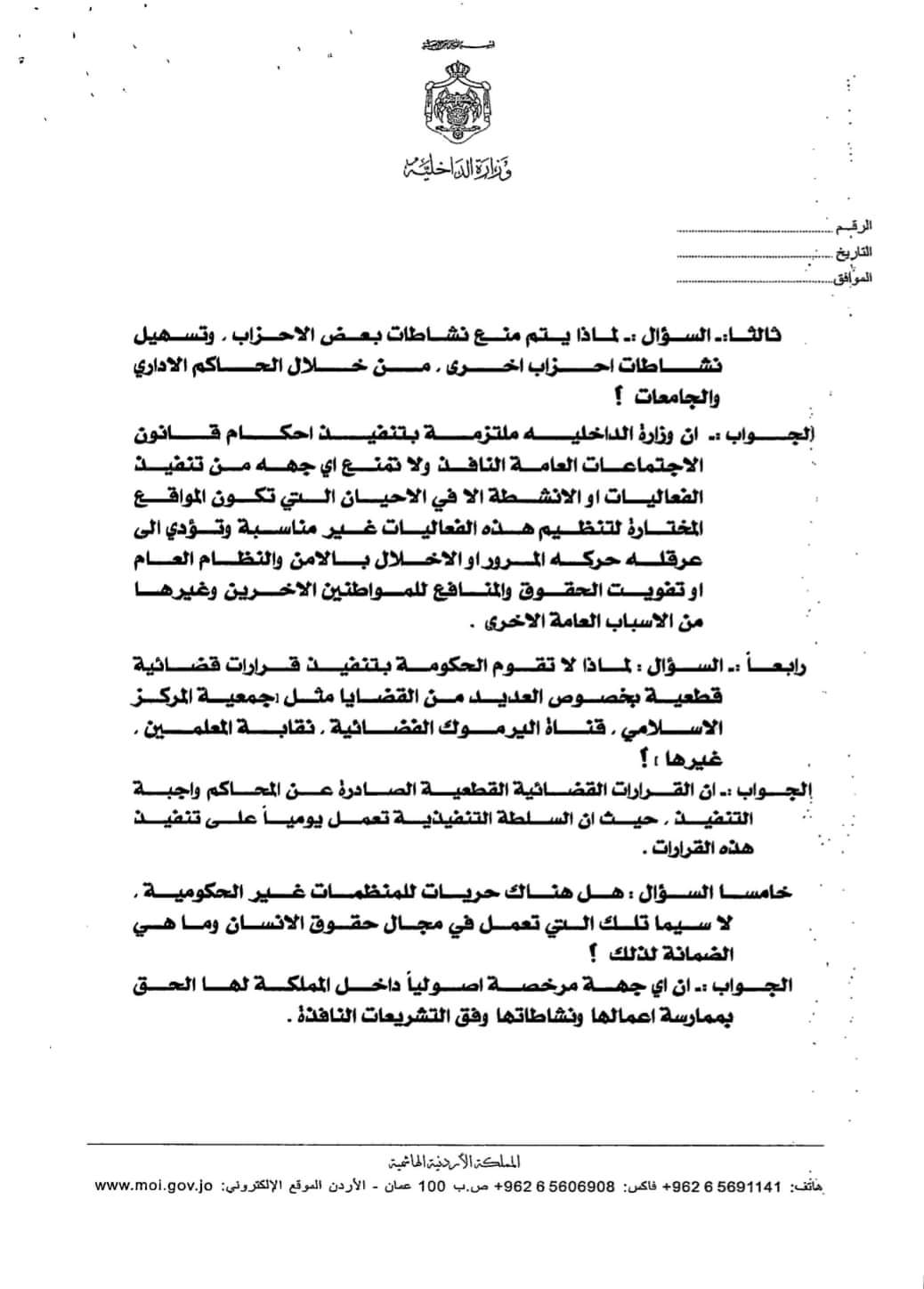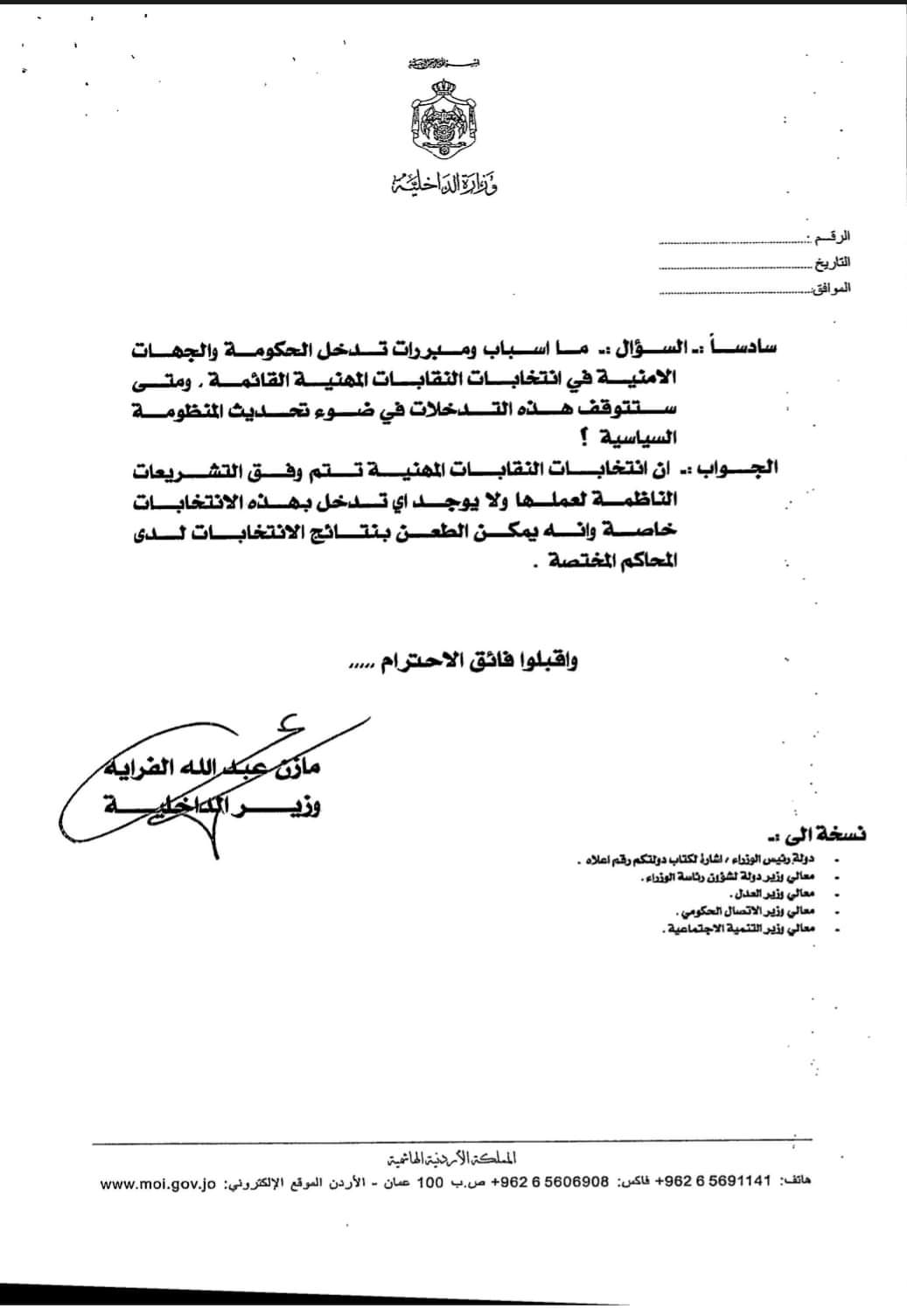 جاء ذلك في اجابته على سؤال نيابي وجهه النائب عدنان مشوقة حول واقع الحريات في الأردن، وتدخل الحكومة والجهات الأمنية في انتخابات النقابية، وعمل مراكز حقوق الانسان.