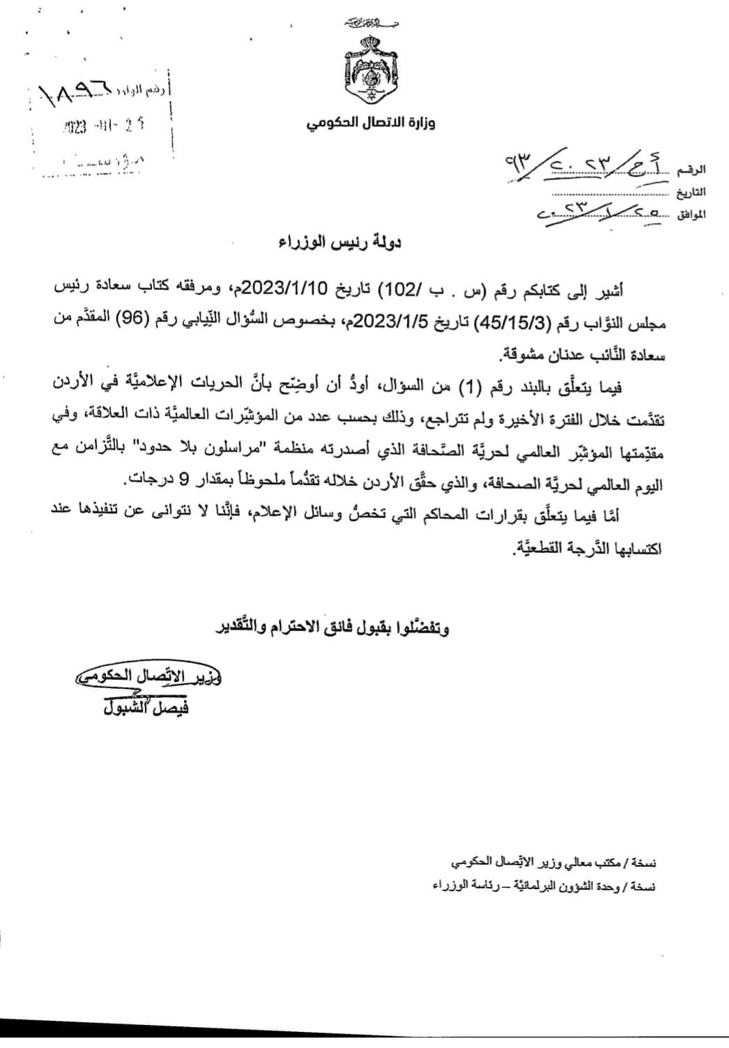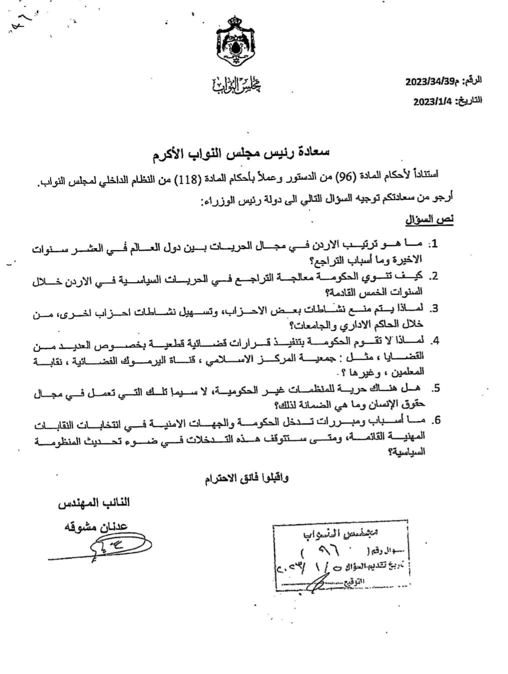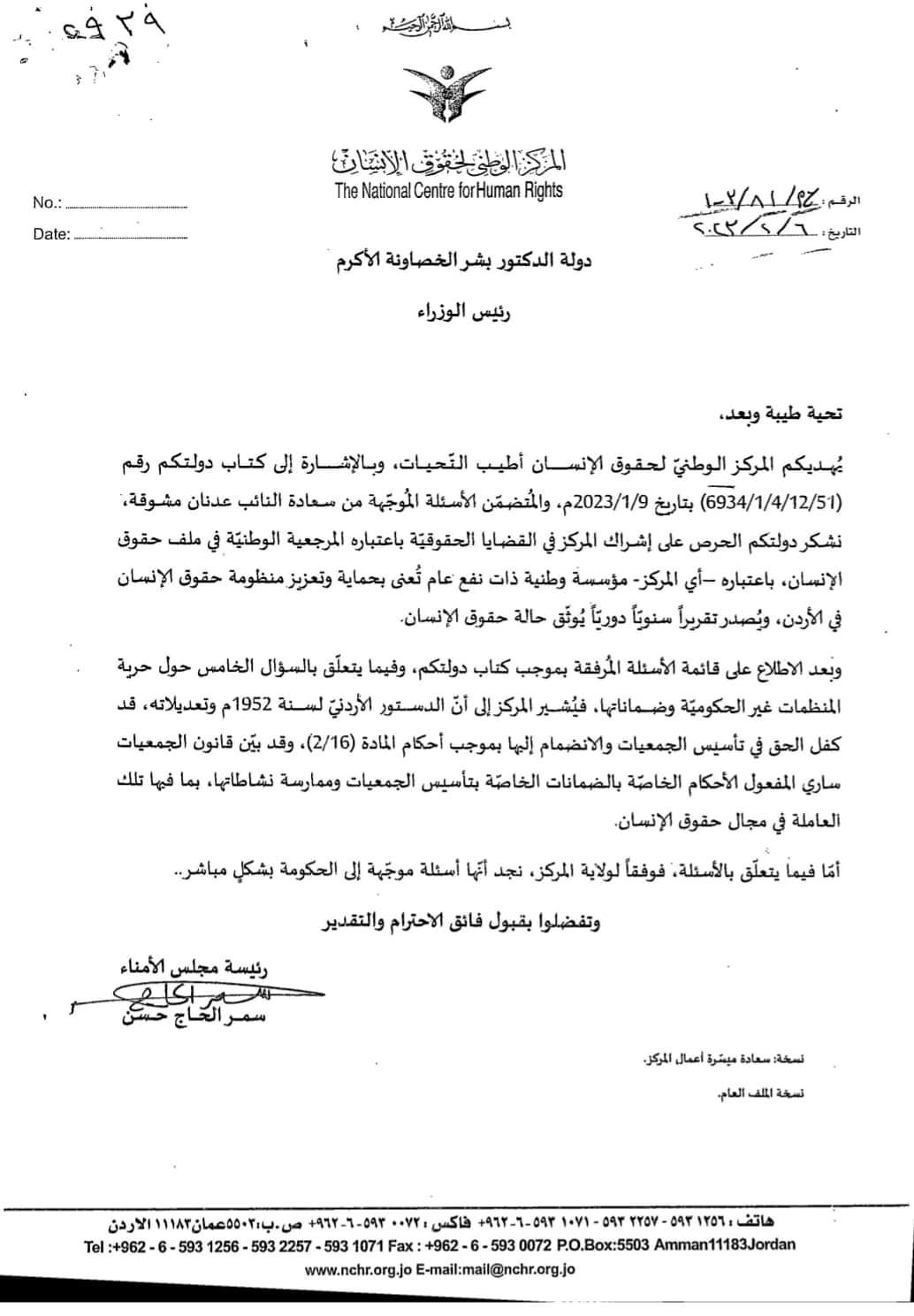 جاء ذلك في اجابته على سؤال نيابي وجهه النائب عدنان مشوقة حول واقع الحريات في الأردن، وتدخل الحكومة والجهات الأمنية في انتخابات النقابية، وعمل مراكز حقوق الانسان.