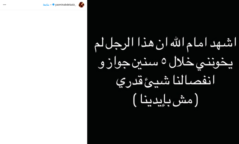 وكتبت ياسمين عبدالعزيز عبر حسابها على إنستغرام، الأربعاء: "أشهد أمام الله أن هذا الرجل لم يخونني خلال 5 سنوات زواج، وانفصالنا شيء قدرنا (مش بايدينا)".