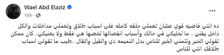 قال "وائل" خلال منشور له: "أنت متفرغة لإعداد حلقة كاملة عن أسباب طلاق وتخصصي مداخلات حتى يفتي الجميع.. أسباب انفصال ياسمين تخصها هي فقط ولا يعنيكي.. كان بالإمكان إعلان الخبر وتتمنين الخير للناس بدلا من هذه النميمة والقيل والقال.. بالأحرى تفصحين عن أسباب طلاقك أنت للناس".