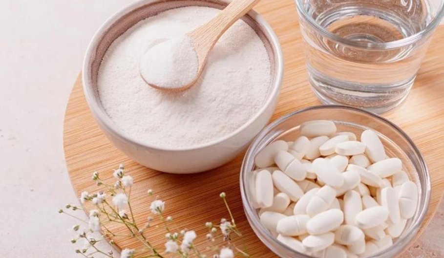 ويأتي الكولاجين في شكل مكملات غذائية دون وصفة طبية، مثل الكبسولات أو المسحوق، ويمكن أيضاً استهلاكه في الجيلاتين في الأطعمة مثل الجيلي، والمارشميلو، وجلد بعض الأسماك.ولم تحسم نتائج الدراسات جدوى تناوله بالفم، سواء بالنظام الغذائي أو عن طريق المكملات الغذائية.