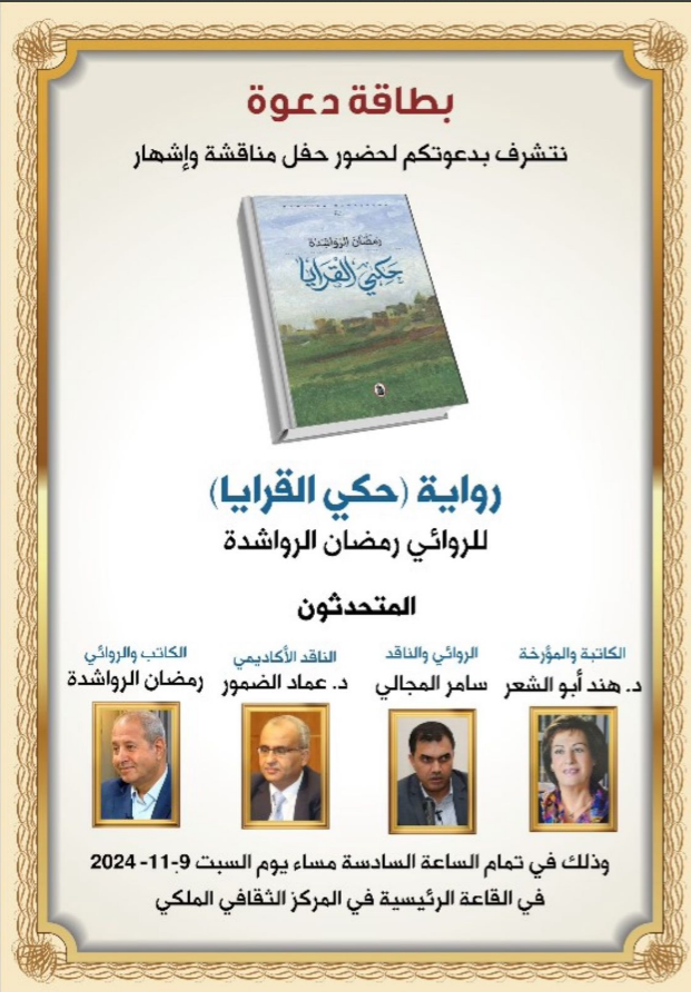 يقام في تمام الساعة السادسة مساء السبت القادم ٩-١١ حفل مناقشة وإشهار رواية حكي القرايا للكاتب والروائي رمضان الرواشدة وذلك في المركز الثقافي الملكي.