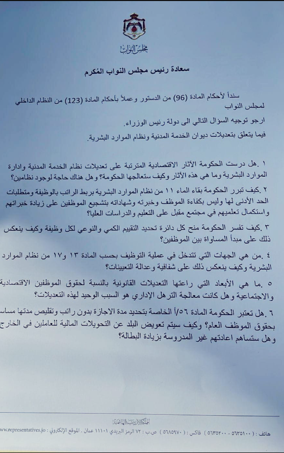 ٦. هل تعتبر الحكومة المادة ٥٦/أ الخاصة بتحديد مدة الاجازة بدون راتب وتقليص مدتها مساسا بحقوق الموظف العام؟ وكيف سيتم تعويض البلد عن التحويلات المالية للعاملين في الخارج؟ وهل ستساهم اعادتهم غير المدروسه بزيادة البطاله؟.