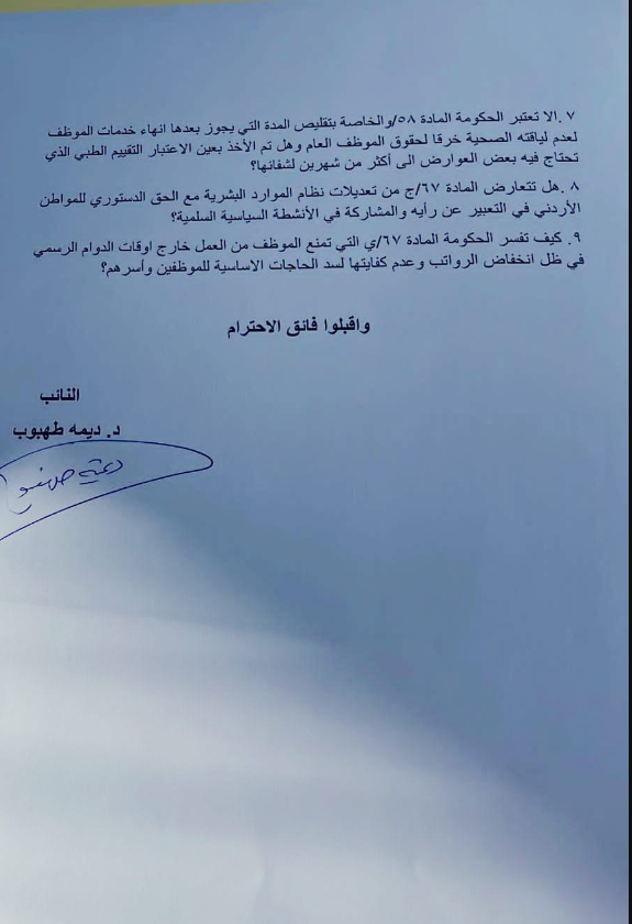 ٧. الا تعتبر الحكومة المادة ٥٨/و الخاصة بتقليص المدة التي يجوز بعدها انهاء خدمات الموظف لعدم لياقته الصحيه خرقا لحقوق الموظف العام وهل تم الأخذ بعين الاعتبار التقييم الطبي الذي تحتاج فيه بعض العوارض الى اكثر من شهرين لشفائها؟.