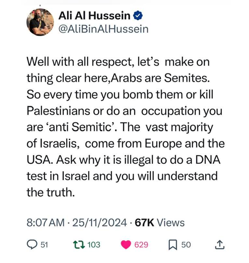 وقال في تغريدة باللغة الإنجليزية : حسنًا، بكل احترام، دعونا نوضح شيئًا واحدًا هنا، العرب ساميون. لذا في كل مرة تقصفهم أو تقتل فلسطينيين أو تقوم باحتلال، فأنت "معادٍ للسامية".