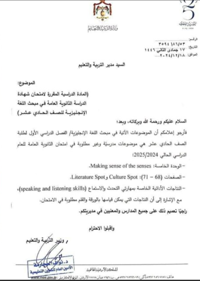 أصدرت وزارة التربية والتعليم كتابا بينت فيه، مواضيع دراسية غير مطلوبة لمادة اللغة الإنجليزية للصف الحادي عشر للعام الدراسي 2024 / 2025.