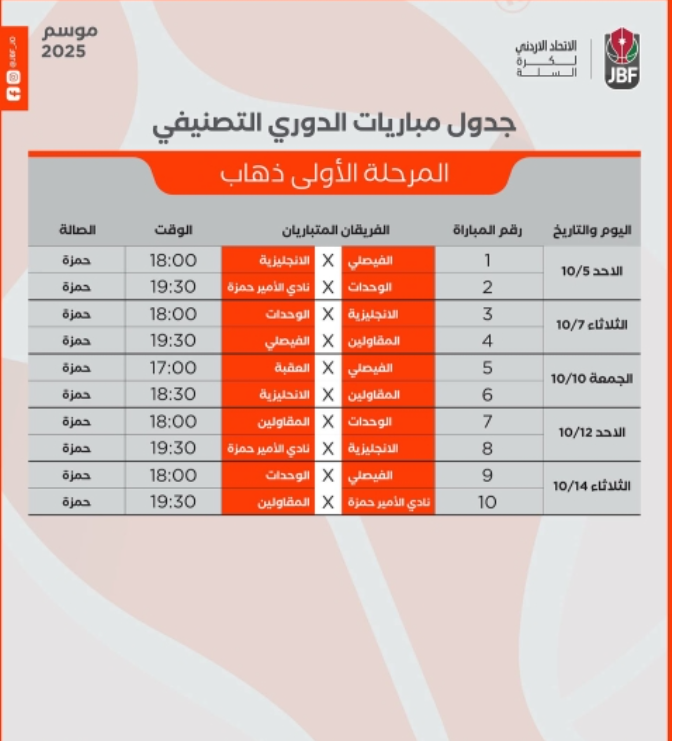 تنطلق منافسات الدوري التصنيفي لكرة السلة للرجال في 5 تشرين الأول المقبل، بمشاركة أندية الفيصلي، والإنجليزية، والوحدات، والمقاولين، والأمير حمزة (العقبة)، على أن تستمر حتى 31 من الشهر ذاته.وتقام البطولة وفق نظام الدوري الكامل من مرحلتين (ذهاب وإياب)، بهدف تحديد المراكز النهائية للفرق المشاركة، حيث...