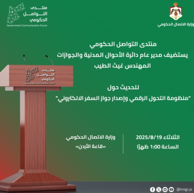 يعقد أمين عام وزارة الاتصال الحكومي الدكتور زيد النوايسة ومدير عام دائرة الأحوال المدنية والجوازات المهندس غيث الطيب لقاء مع ممثلي وسائل الإعلام بعنوان منظومة التحول الرقمي وإصدار جواز السفر الإلكتروني عند الساعة الواحدة من ظهر يوم غد الثلاثاء في مقر وزارة الاتصال الحكومي.ويتناول اللقاء إنجازات...