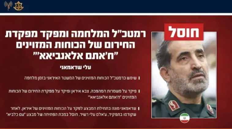في تطور أمني، أعلن الجيش الإسرائيلي، الثلاثاء، عن اغتيال اللواء علي شادماني، قائد مقر خاتم الأنبياء المركزي وأعلى قائد عسكري في النظام الإيراني حاليًا، خلال غارة جوية استهدفته وسط العاصمة الإيرانية طهران بعد عملية استخباراتية دقيقة.يُعد شادماني من الشخصيات العسكرية المقربة مباشرة من المرشد الأعلى...