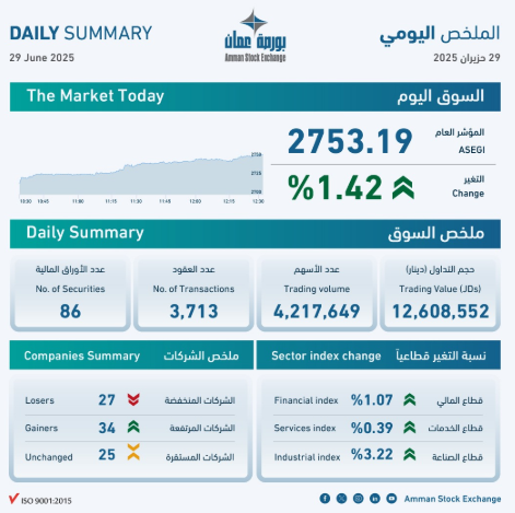 اغلقت بورصة عمان، اليوم الأحد، تداولاتها على ارتفاع نسبته 1.42 بالمئة الى مستوى 2753 نقطة، حيث بلغت الأسهم المتداولة 4.2 مليون سهم بقيمة 12.6 مليون دينار نتيجة عقد 3713 صفقة.وفي مقارنة أسعار الإغلاق للشركات المتداولة أسهمها، تبين أن 27 شركة أظهرت انخفاضا في أسعار أسهمها، بينما ارتفعت أسهم 34 شركة...