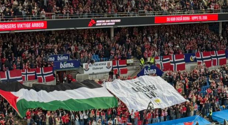 رفعت جماهير منتخب النرويج علمًا ضخمًا لفلسطين قبل انطلاق مباراة منتخب بلادهم أمام منتخب الاحتلال الإسرائيلي، ضمن تصفيات كأس العالم 2026.