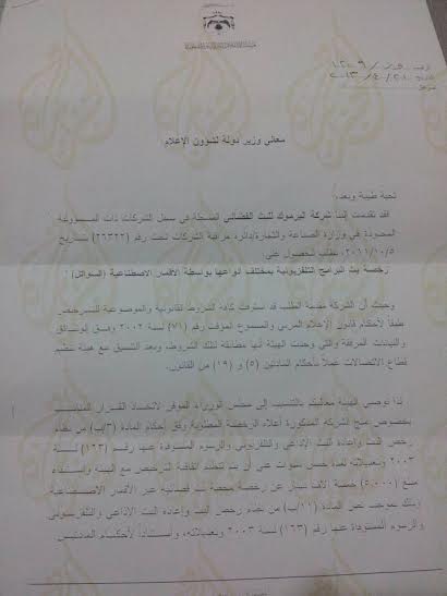 وخاطبت هيئة الاعلام المرئي والمسموع الوزير بأنه و"حيث أن الشركة مقدمة الطلب قد استوفت كافة الشروط القانونية والموضوعية للترخيص طبقاً لأحكام قانون الإعلام المرئي والمسموع المؤقت رقم (71) لسنة 2002 وفق الوثائق والبيانات المرفقة والتي وجدت الهيئة بأنها مطابقة لتلك الشروط، وبعد التنسيق مع هيئة تنظيم قطاع الاتصالات عملاً بأحكام المادتين (5) و (19) من القانون".