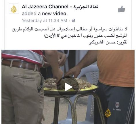 سحبت قناة الجزيرة الفضائية، اليوم الجمعة، تقريرها حول الانتخابات النيابية الأردنية عن مواقع التواصل الاجتماعي، والذي كان بعنوان "لا مناظرات سياسية أو مطالب إصلاحية.. هل أصبحت الولائم طريق المرشّح لكسب عقول وقلوب الناخبين في الأردن؟".