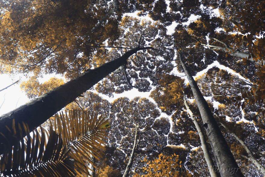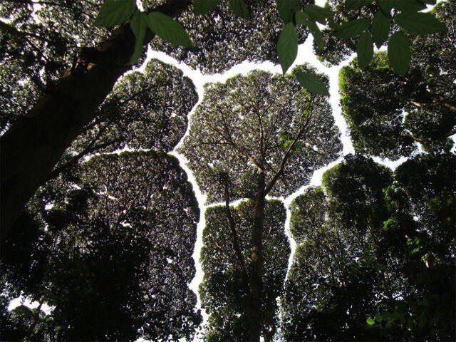صور لظاهرة "خجل التاج او تاج الحياء " حيث تحافظ تيجان الأشجار على مسافة بينية بين بعضها البعض.