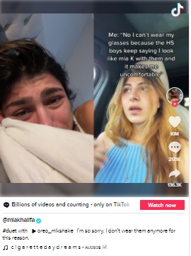 ونشرت ميا خليفة عبر حسابها على تطبيق "تيك توك" مقطع فيديو وهي تبكي بعدما شاهدت فتاة تعرضت للتنمر بسبب شبهها بنجمة الأفلام الإباحية وبأن هذا التشابه تسبب في تدمير حياتها وعلاقتها مع أصدقائها.