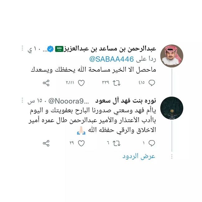ليفاجئها الأمير عبدالرحمن بتعليق على تغريدتها بالقول: "ما حصل إلا الخير مسامحة الله يحفظ ويسعدك"، فيما كتبت الأميرة نورة بنت فهد آل سعود على اعتذار أم فهد: "يا أم فهد وسعتي صدورنا البارح بعفويتك واليوم بأدب الاعتذار والأمير عبدالرحمن طال عمره أمير الأخلاق والرقي حفظه الله".