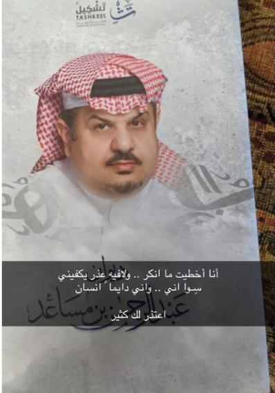 ونشرت هيفاء صورة للأمير مساعد وعلقت عليها: “أنا أخطيت ما أنكر.. ولا فيه عذر يكفيني سوى اني .. واني دائما انسان.. اعتذر لك".