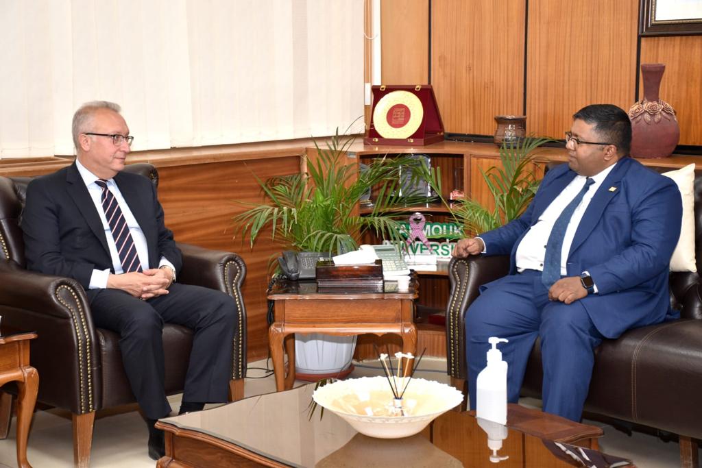 التقى رئيس جامعة اليرموك الدكتور إسلام مسّاد، المدير الإقليمي لمؤسسة كيو إس لتقييم أداء الجامعات في منطقة الشرق الأوسط وشمال أفريقيا وجنوب آسيا الدكتور آشوين فرنانديز، والمسؤول الإقليمي في الشرق الأوسط وأفريقيا رامي عواد، حيث تم استلام شهادة تقييم "الخمس نجوم" في نظام التقييم العالمي QS Stars لأداء الجامعات حول العالم، والتي حصلت عليها الجامعة من المرة الأولى التي تتقدم بها لهذا التقييم.