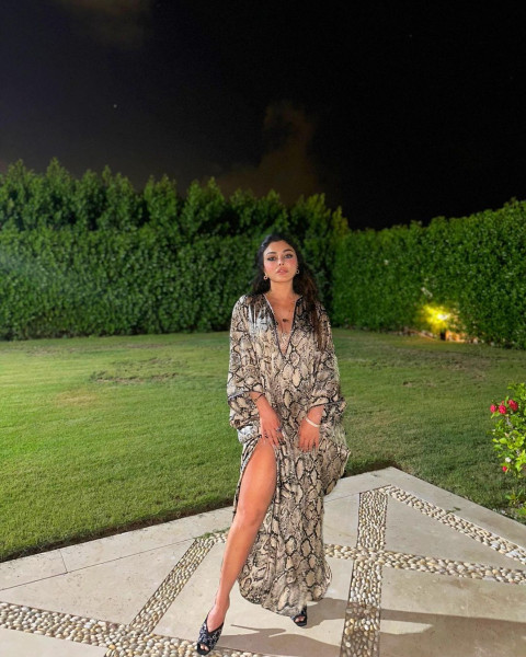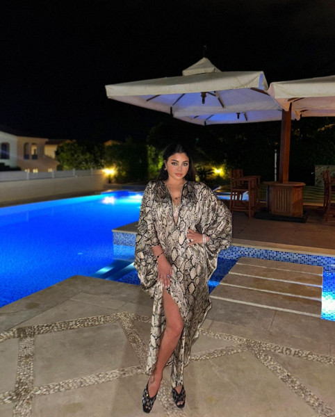 وتميّزت عباءة هيفاء وهبي الطويلة بنقشاتها المستوحاة من جلد الثعبان، وبتصميمها الفضفاض وصولاً إلى الكمّين، مع فُتحة على شكل (V) عند الصدر.