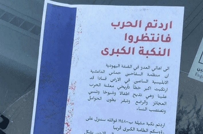وزع مستوطنون رسائل لترهيب وترويع الفلسطينيين في الضفة، وتهددهم - بما وصفة المستوطنون - بالنكبة الكبرى.