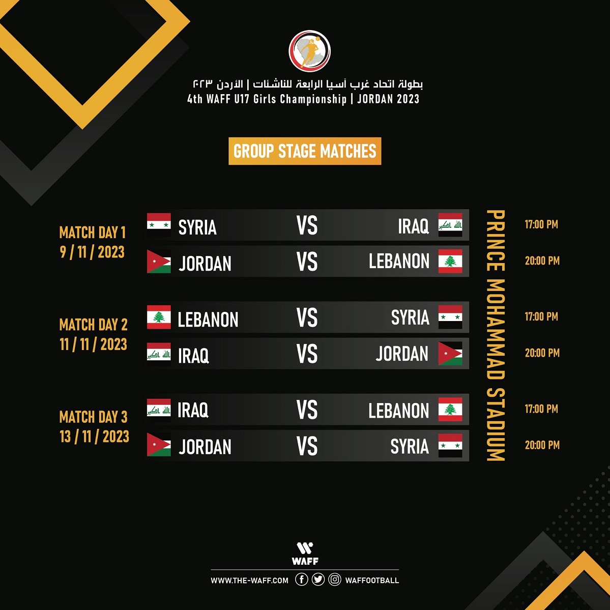 وبحسب جدول البطولة، يلتقي بالمباراة الافتتاحية عند الخامسة مساء ٩ تشرين الثاني ٢٠٢٣ بتوقيت الأردن منتخبا سوريا والعراق، وتلي ذلك باليوم نفسه مباراة الأردن ولبنان عند الساعة الثامنة مساءً.