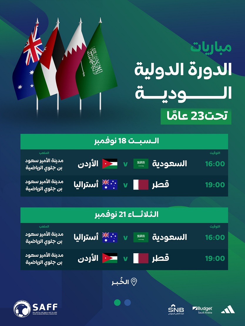 تستضيف الخبر الدورة الدولية الودية (تحت 23 عامًا)، بمشاركة منتخبات (السعودية، قطر، الأردن، أستراليا)، خلال الفترة من 18-21 نوفمبر/تشرين ثان الجاري.
