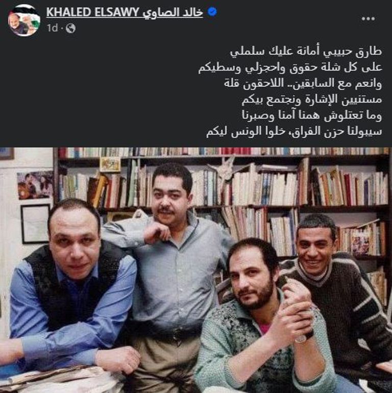 وكتب خالد الصاوي عبر حسابه الشخصي على موقع "فيسبوك": "طارق حبيبي.. أمانة عليك سلم لي على كل شلة حقوق واحجزلي وسطيكم".