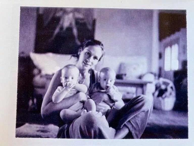 وظهرت جوليا روبرتس بالأبيض والأسود، وهي تحمل التوأم وهما في سن الطفولة، وتجلس على الأرض، وعلى وجهها ابتسامة.