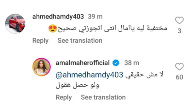 وبسؤالها عما إذا كانت قد تزوجت، ردت "آمال" على أحد متابعيها: "ليس حقيقيا، ولو حدث سأقول".