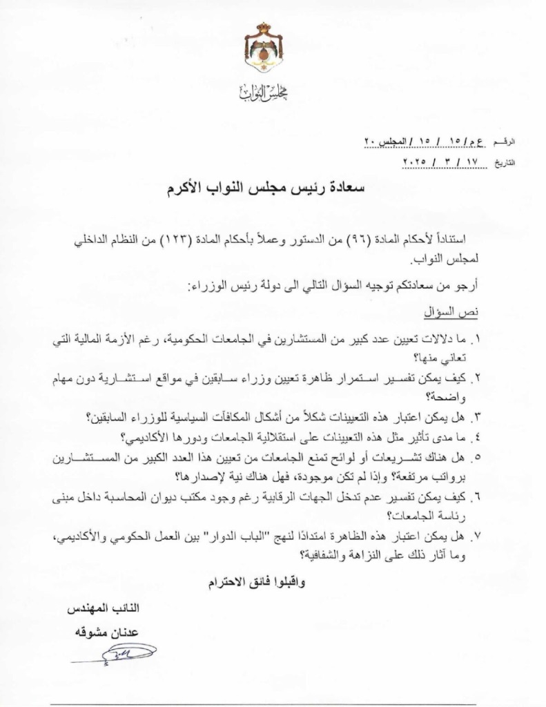 وجه النائب عدنان مشوقة سؤالًا نيابيًا إلى رئيس الوزراء حول ظاهرة تعيين أعداد كبيرة من المستشارين في الجامعات الحكومية، وذلك رغم الأزمات المالية التي تواجهها هذه المؤسسات الأكاديمية.