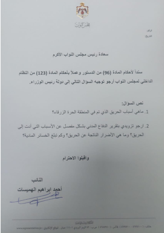 وجه النائب الثاني لرئيس مجلس النواب احمد الهميسات سؤالاً نيابياً لدولة رئيس الوزراء جعفر حسان حول أسباب حريق المنطقة الحرة في الزرقاء مطالباً بتزويده بتقرير الدفاع المدني بشكل مفصل عن الأسباب التي أدت إلى الحريق وما هي الأضرار الناتجة وقيمة الخسائر المادية.