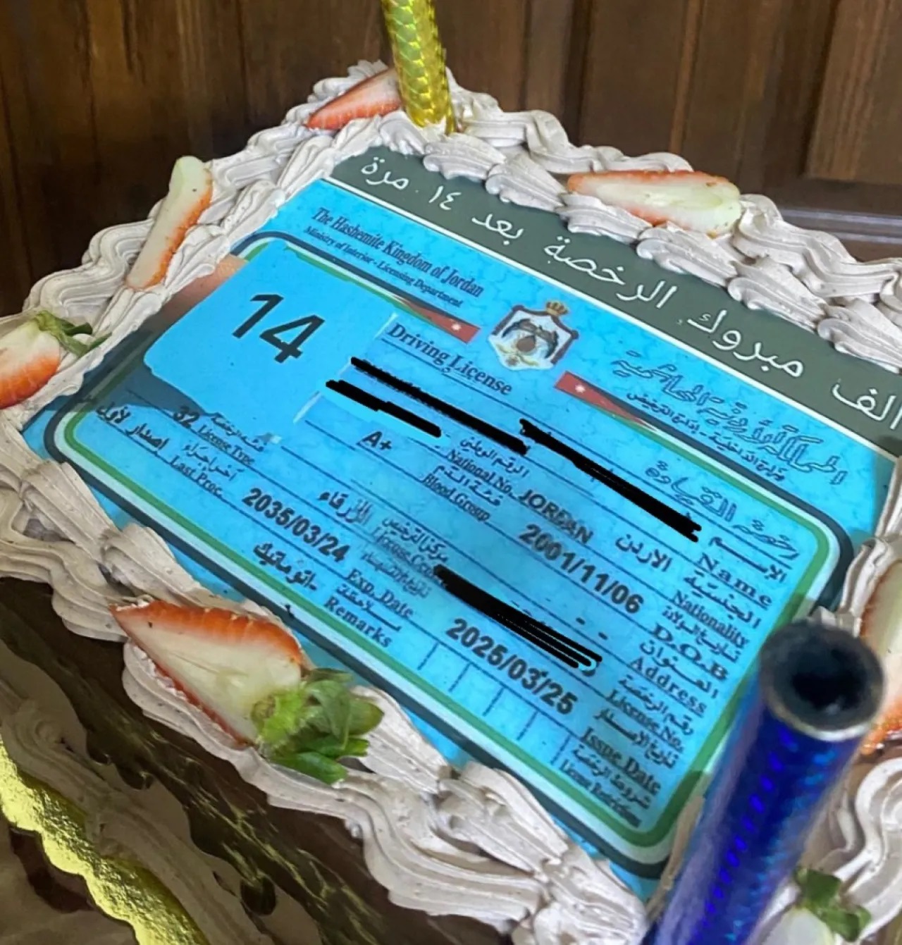 وقررت الفتاة الاحتفال بهذه المناسبة بطريقتها الخاصة ، وذلك بتصميم قالب حلوى على شكل رخصة قيادة تحمل عبارة "ألف مبروك الرخصة بعد 14 مرة".