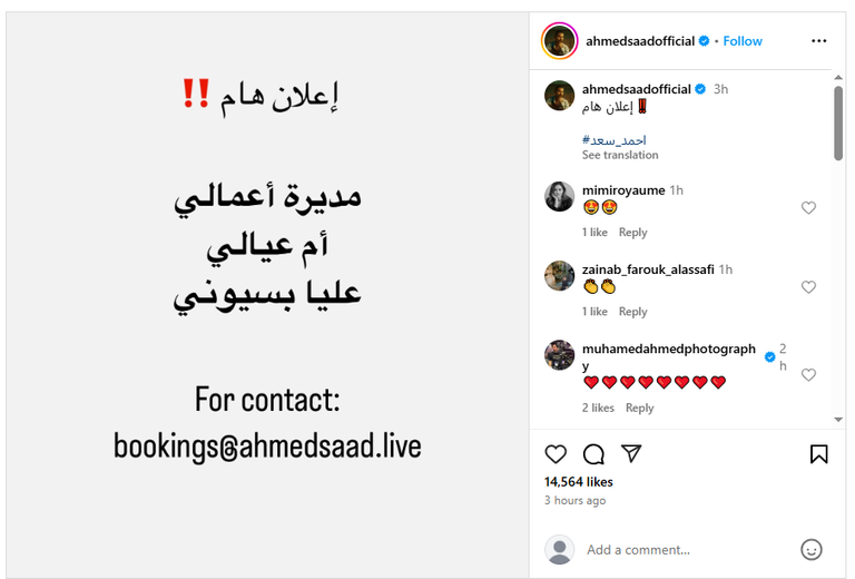 ونشر أحمد سعد عبر حساباته على مواقع التواصل الاجتماعي منشورًا قال فيه: "مديرة أعمالي أم عيالي عليا بسيوني"، وهو ما لاقى تفاعلًا واسعًا من جمهوره الذين أشادوا بهذه الخطوة.